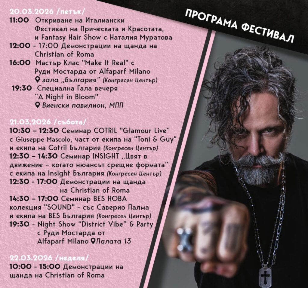 Тазгодишното издание на Италианския фестивал на красотата и прическата ще предложи няколко нови и впечатляващи акцента в програмата. Сред най-очакваните събития е участието на световно признатия стилист Руди Мостарда – глобален творчески директор на Alfaparf Milano Professional, който ще проведе своя мастърклас „Make it Real“ и ще бъде звездата на вечерното сценично шоу „District Vibe“.