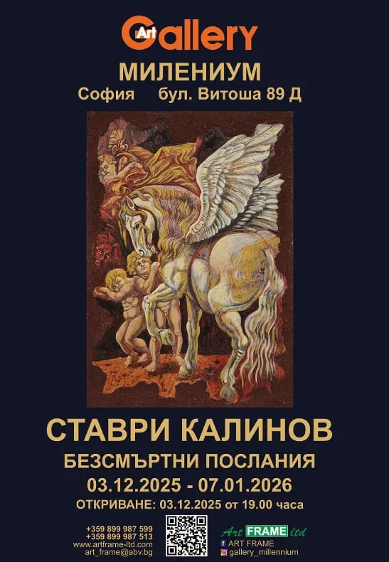 Арт пространството на галерия „Милениум“ в Гранд Хотел Милениум София се превърна в сцена на изкуството, вдъхновено от безсмъртните послания на Ставри Калинов. 62 впечатляващи произведения на авангардния творец, който си отиде през 2023 г., бяха включени в експозицията и оживяха отново пред публиката.