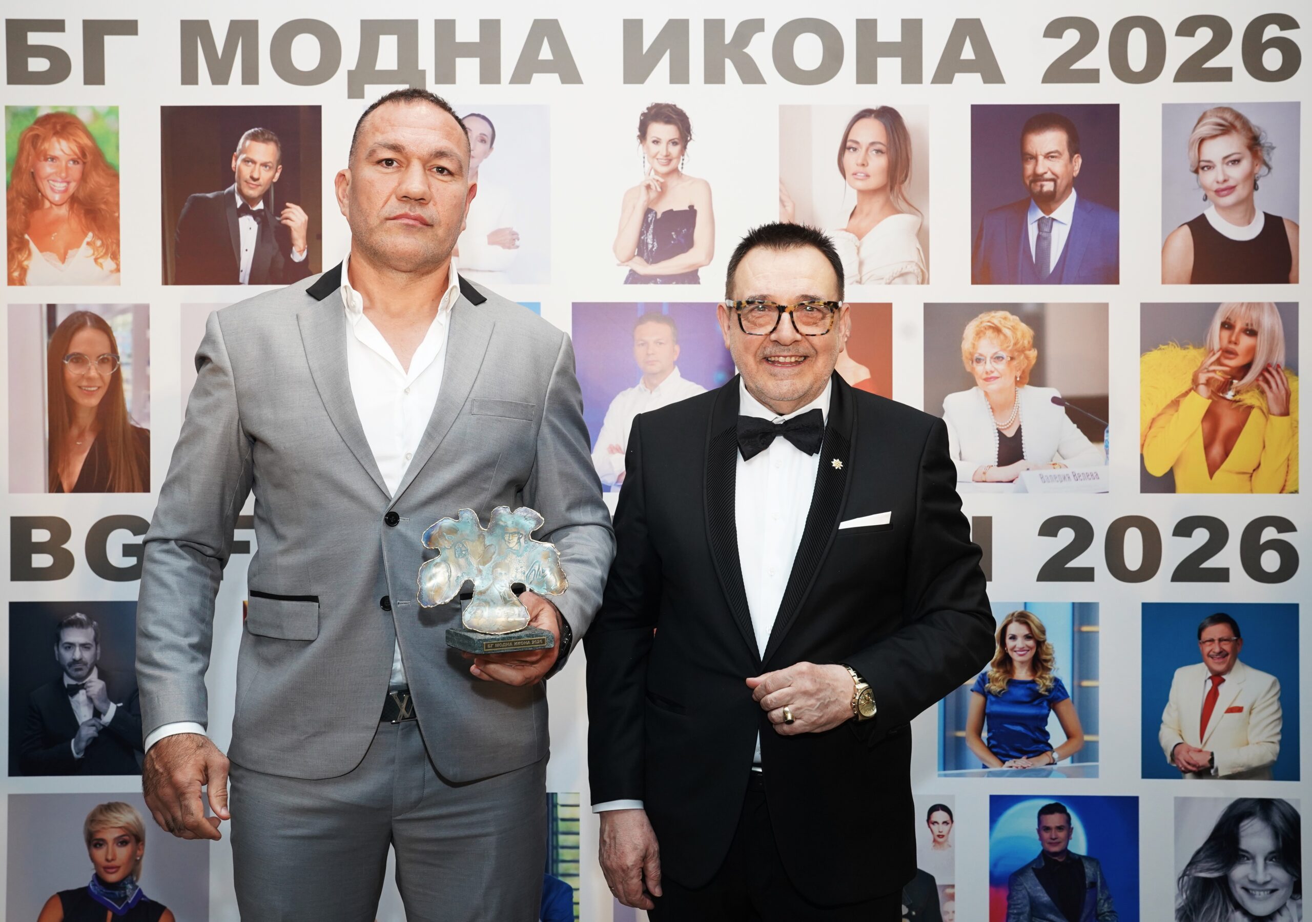 Проф. Любомир Стойков и Кубрат Пулев -носител на приза „БГ модна икона 2026“ в категория „Спорт“.