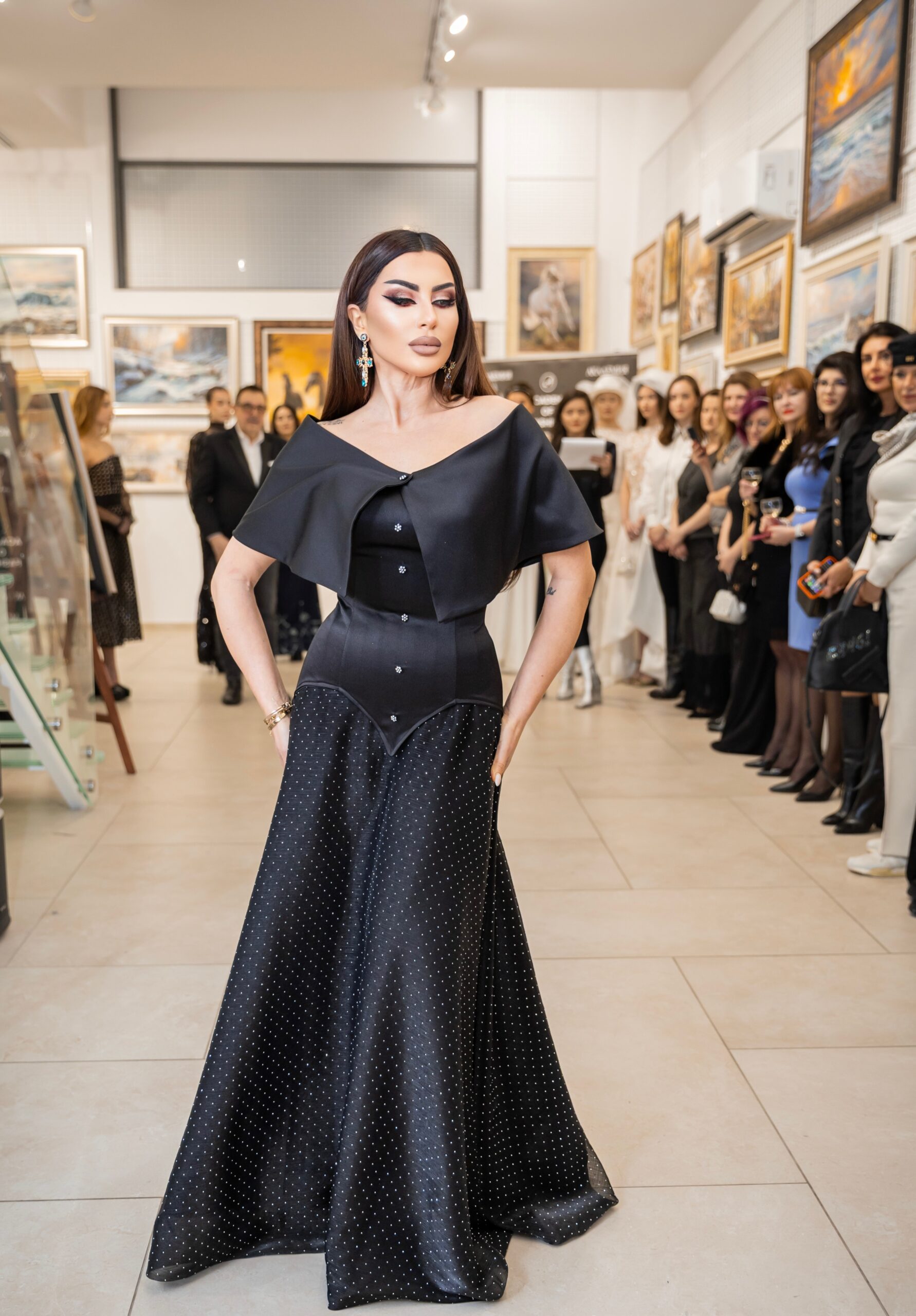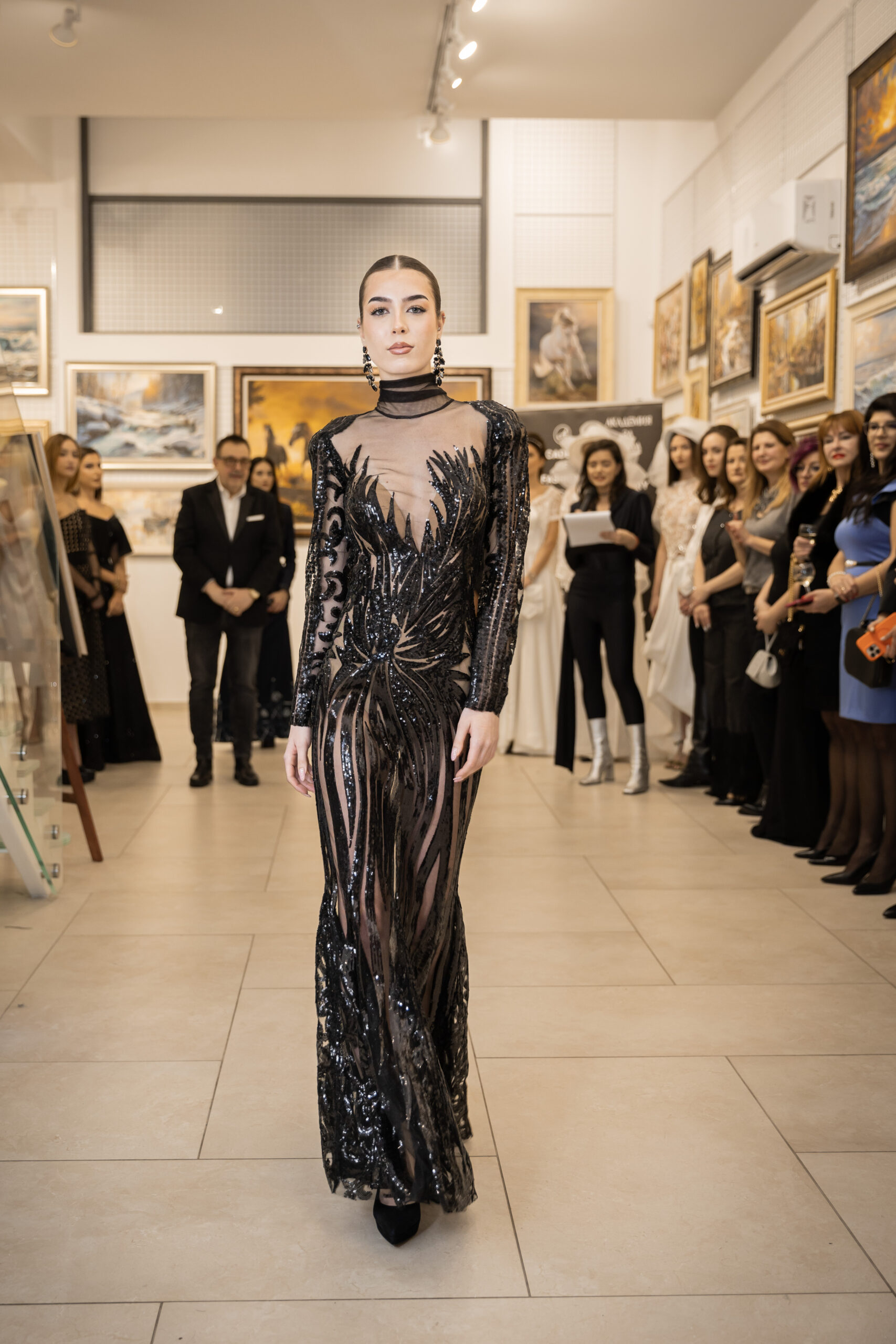 Есил Дюран – дизайнер на Fashion Gallery Esil Duran и носител на „Златна игла 2025“ в категория „Визионерство в музиката и модата“, презентира черна дантелена рокля, в която фин блясък и ефирна прозрачност се преплитат в изискан контраст.