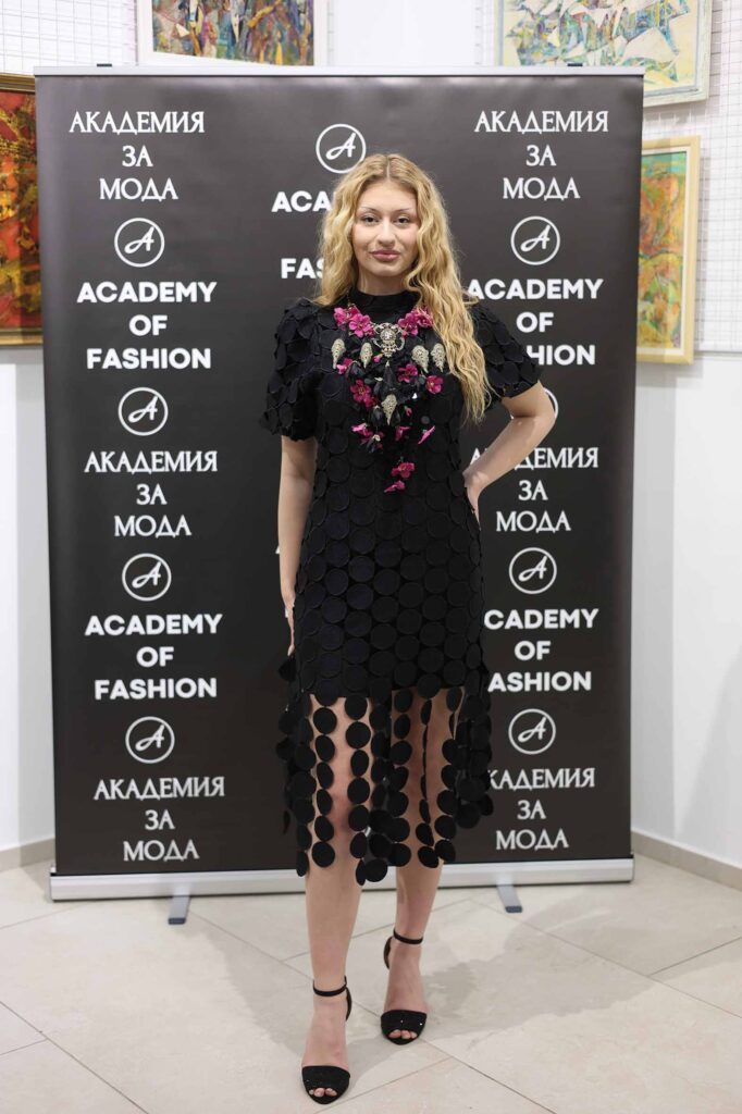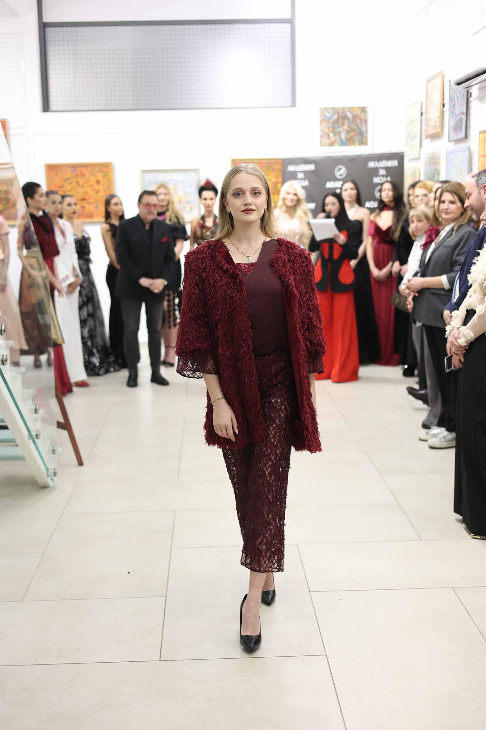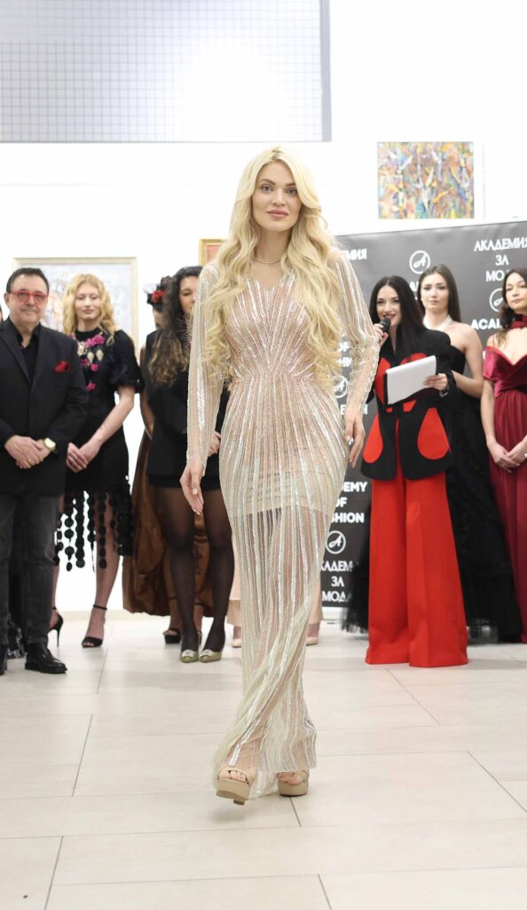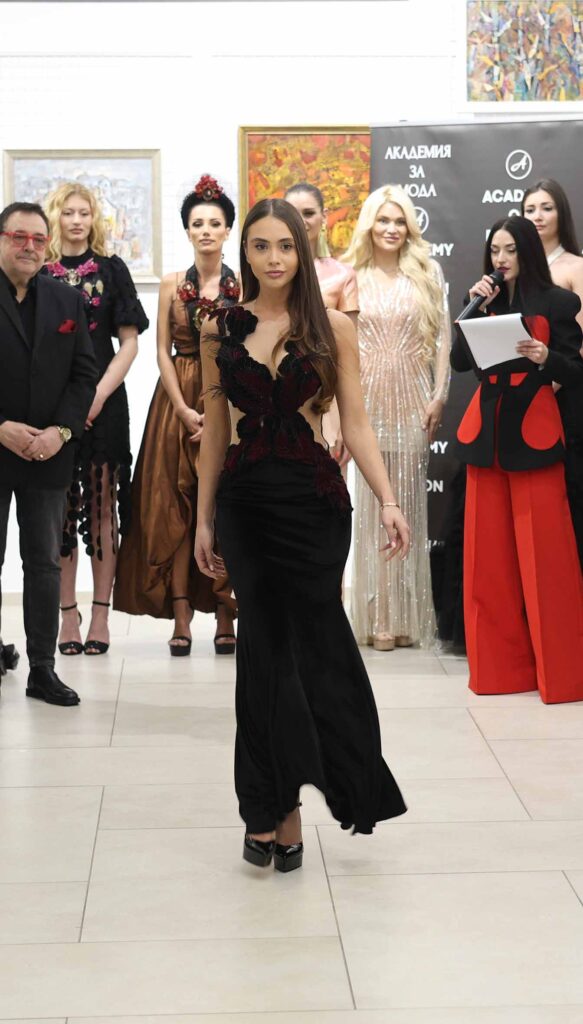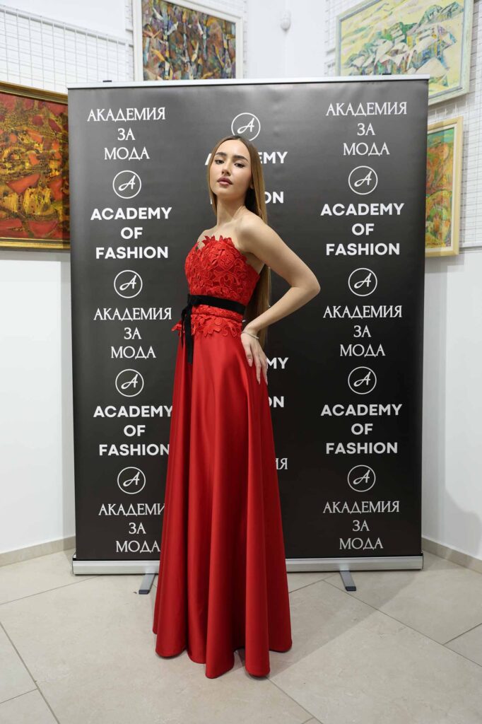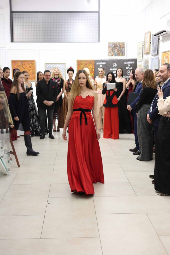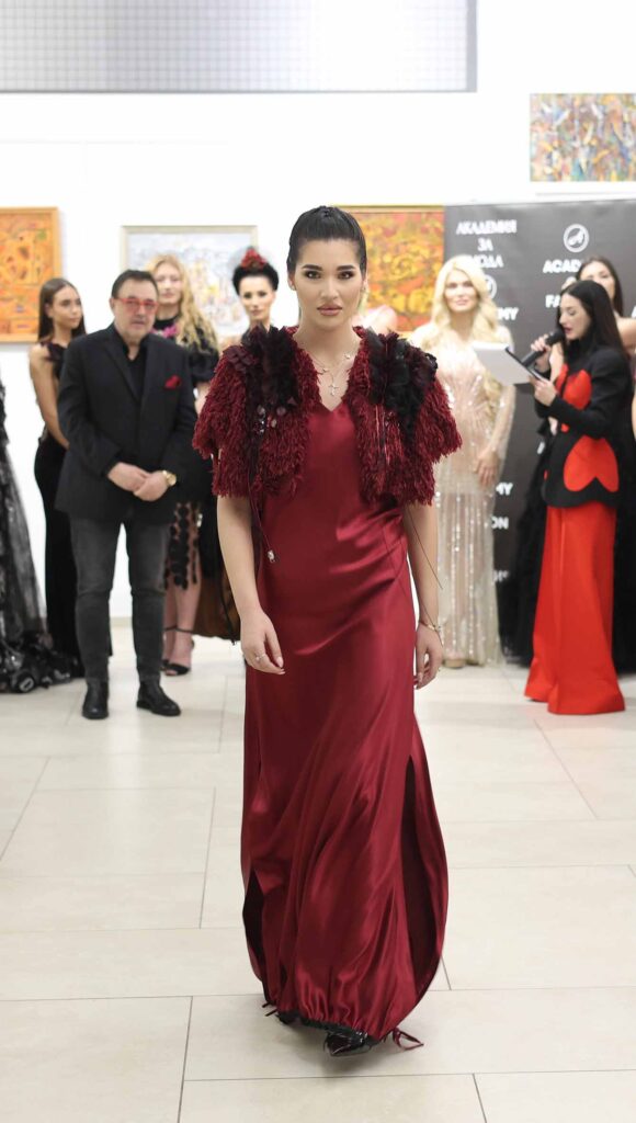 Модното ревю започна с Ивет Бианки – носител на „Изгряваща звезда 2025“ в категория „Международни успехи“ и носител на „Златна игла 2024“ в категория „Най-добър млад дизайнер“. Тя презентира рокля от последната си колекция в дълбок, наситен червен цвят. Корсетната линия деликатно подчертава силуета, а черният колан с панделка акцентира талията и добавя драматичен контраст.