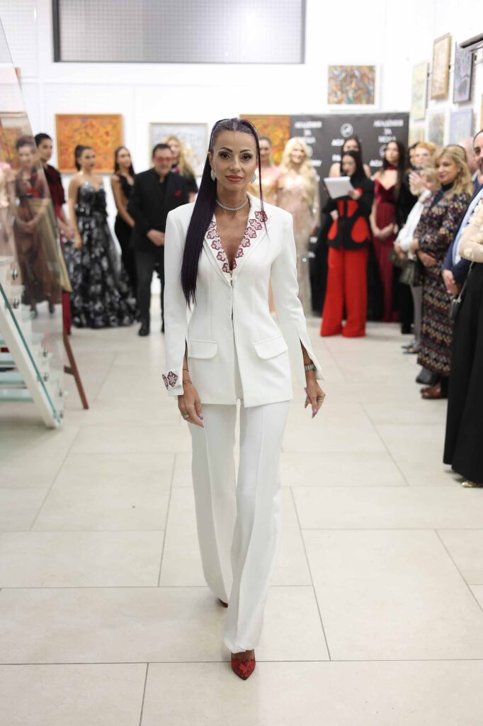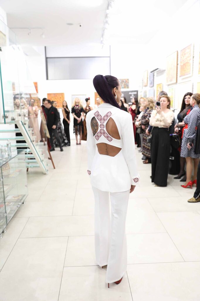 Модният бранд Kerana с дизайнер Ваня Паризова представи тоалет „Пазителка“, който представлява бял костюм с изчистена линия и автентична българска шевица, символ на сила, защита и родова памет. Аутфитът впечатлява с прецизна кройка и характерен акцент на гърба, вдъхновен от традиционните орнаменти, интерпретирани в модерна визия.