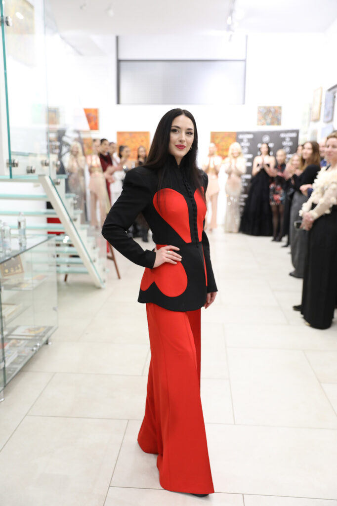 Нели Радева – дизайнер на модния бранд „Кармин“, презентира две визии, посветени на темата. Първият аутфит представя по-съвременната линия в духа на Валентино – комбинация от структура и прозрачност. Карминеният нюанс тук е интерпретация на Valentino Red – не като буквален цитат, а като усещане за сила и присъствие. Второто предложение разкрива поетичната страна на стила – лекота, движение и мекота в силуета. Ефирната материя създава усещане за въздух и свобода, а акцентът в горната част придава драматургия и завършен художествен жест.