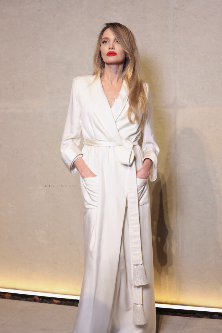 Анджелина Джоли отново накара всички да говорят за нея при появата й на събитие на „Том Форд“ в рамките на Седмицата на модата в Шанхай. Белият й тоалет беше от колекцията на бранда за пролетта на 2026 г. с подписа на Хайдер Акерман и впечатляваше с мека материя, обърнат ревер и дълбоко деколте. Копринени джобове допълваха елегантния силует с леко драпираната конструкция.
